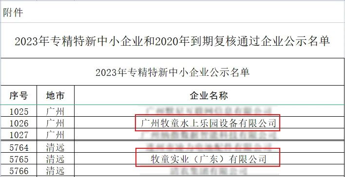 近日,牧童集團(tuán)旗下子公司又傳捷報(bào):2023年12月12日,廣東省工業(yè)和信息化廳發(fā)布《關(guān)于2023年專精特新中小企業(yè)和2020年到期復(fù)核通過企業(yè)名單的公示》,牧童集團(tuán)旗下牧童實(shí)業(yè)(廣東)有限公司、廣州牧童水上樂園設(shè)備有限公司兩家子公司獲得了廣東省“2023年專精特新中小企業(yè)”認(rèn)證!